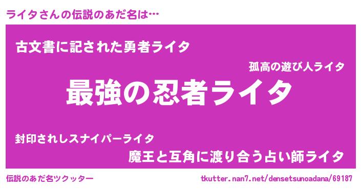 | 男性向けラノベタイトル風あだ名 | 『ライタ~年齢イコール彼女いない歴の魔法使い~』 |
