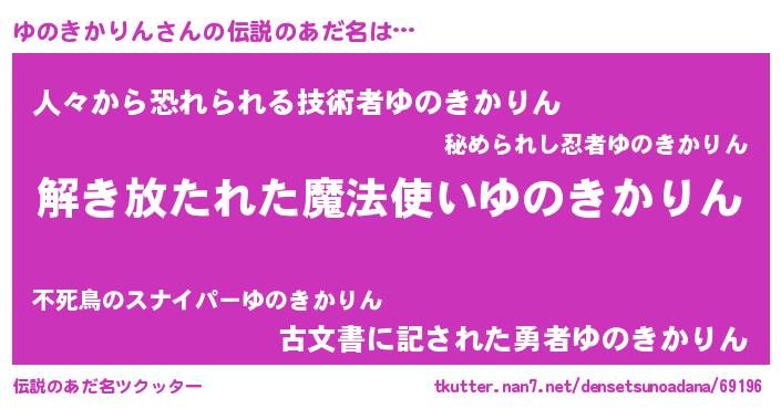 | ポケモン風あだ名 | 『ヒユノキカリン』『ユックウザ』 |