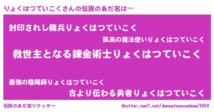 | ヒーロー風カッコイイあだ名 | 『慈愛の使者りょくはつていこく』 |