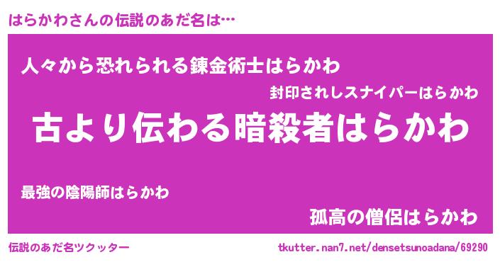 | ヘコむあだ名 | 『はらかわ(笑)』『はらっちょ』 |