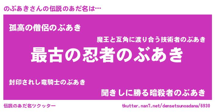 | 意味不明あだ名 | 『自称のぶあき』『のぶあきフォーエバー』 |