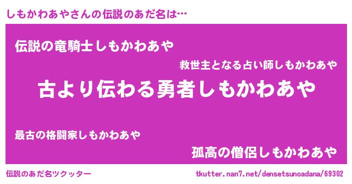 | 男性向けラノベタイトル風あだ名 | 『しもかわあやという概念が存在しない退屈な世界 』 |
