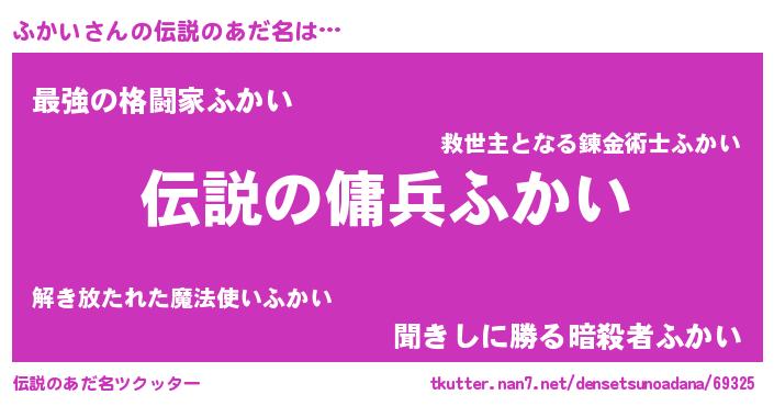 | 男性向けラノベタイトル風あだ名 | 『ふかいの憂鬱』『魔弾の王とふかい』 |