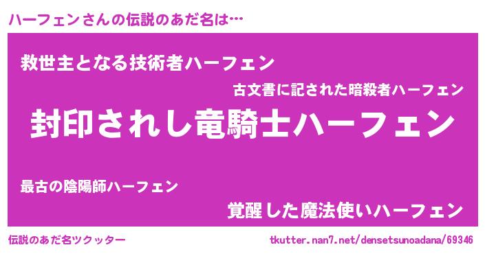 | ヒーロー風カッコイイあだ名 | 『スーパーハーフェン』『幻影騎士ハー』 |