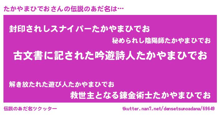| ヒーロー風カッコイイあだ名 | 『仮面タカダー』『ネオタカヤマヒデオ』 |