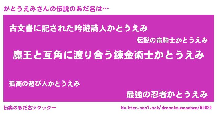 | ヒーロー風カッコイイあだ名 | 『愛の使者かとうえみ』『ネオカトウエミ』 |