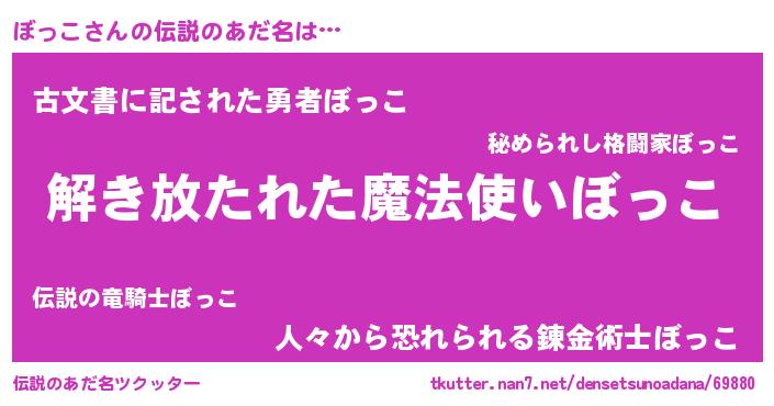 | 女子向けラノベタイトル風あだ名 | 『ぼっこの卵を拾いまして』 |
