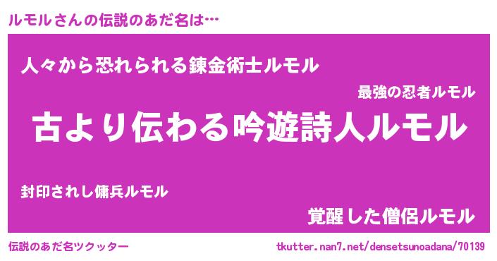 | 男性向けラノベタイトル風あだ名 | 『魔弾の王とルモル』『ルモルスレイヤー』 |