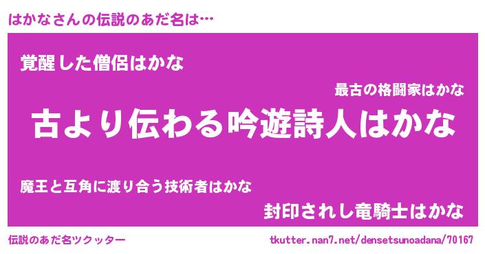| ヒーロー風カッコイイあだ名 | 『ネオハカナ』『炎刃騎士ハカ』 |