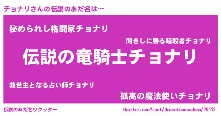 | 男性向けラノベタイトル風あだ名 | 『チョナリの憂鬱』『緋弾のチョナリ』 |