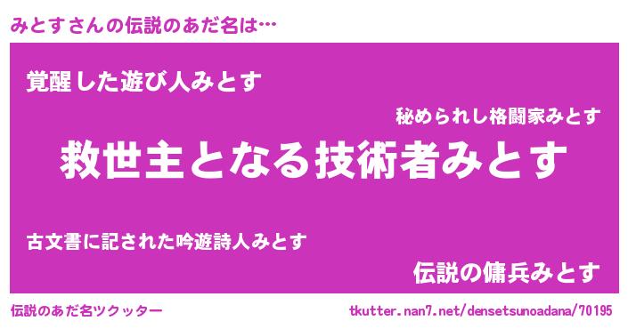 | ヒーロー風カッコイイあだ名 | 『天空の使者みとす』『最強戦士ミトス』 |