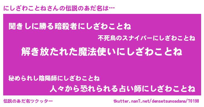 | 男性向けラノベタイトル風あだ名 | 『転生したらにしざわことねだった件』 |