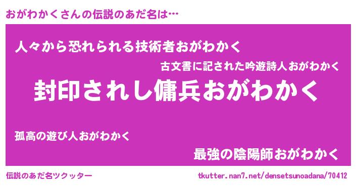 | 意味不明あだ名 | 『ペロリンおがわかく』『自称おがわかく』 |