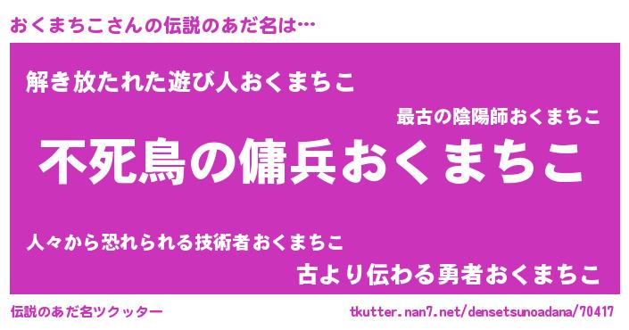 | 女子向けラノベタイトル風あだ名 | 『おくまちこ姫と円卓の騎士』 |