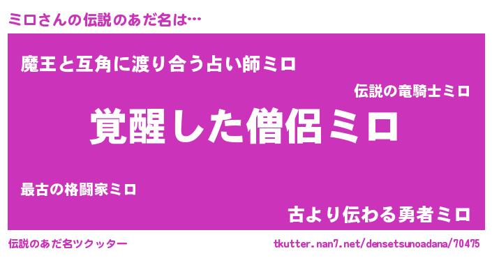 | ヒーロー風カッコイイあだ名 | 『炎刃騎士ミロ』『慈愛の使者ミロ』 |