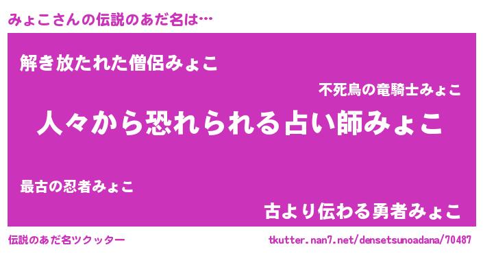 | 男性向けラノベタイトル風あだ名 | 『おまえをオタクにしてやるから、俺をみょこにしてくれ! 』 |