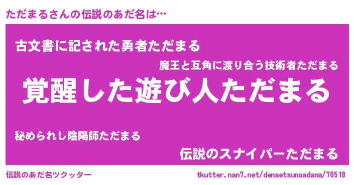 | 男性向けラノベタイトル風あだ名 | 『ただまるの嫁は女の子じゃないと思った?』 |