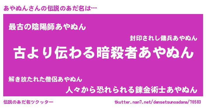 | 男性向けラノベタイトル風あだ名 | 『あやぬんという概念が存在しない退屈な世界 』 |
