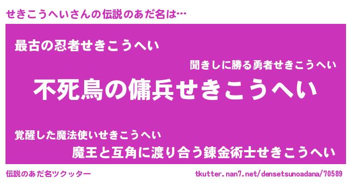 | 男性向けラノベタイトル風あだ名 | 『Re:せきこうへいから始める異世界生活』 |