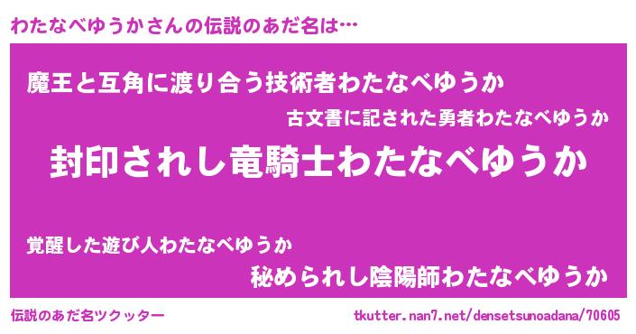 | 男性向けラノベタイトル風あだ名 | 『Re:わたなべゆうかから始める異世界生活』 |