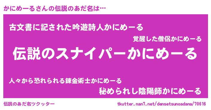 | 男性向けラノベタイトル風あだ名 | 『カニメールスレイヤー』 |