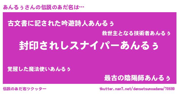 | 男性向けラノベタイトル風あだ名 | 『あんるぅに滅ぼされるだけの簡単なお仕事です』 |