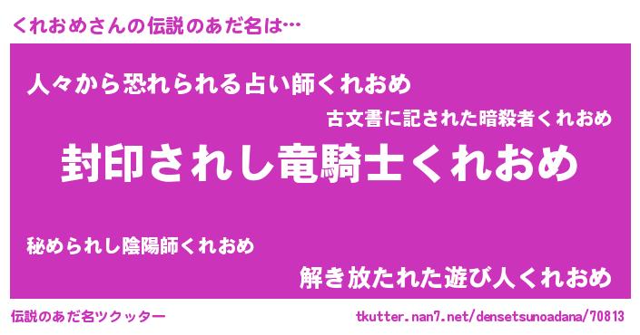 | 男性向けラノベタイトル風あだ名 | 『くれおめに滅ぼされるだけの簡単なお仕事です』 |