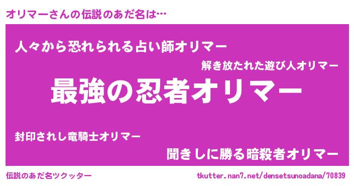 | 男性向けラノベタイトル風あだ名 | 『オリマー~年齢イコール彼女いない歴の魔法使い~』 |