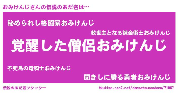 | 男性向けラノベタイトル風あだ名 | 『おみけんじ~年齢イコール彼女いない歴の魔法使い~』 |