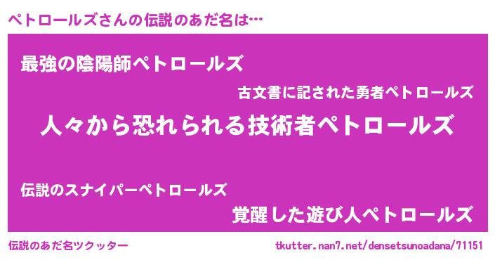 | 男性向けラノベタイトル風あだ名 | 『ペトロールズスレイヤー』 |