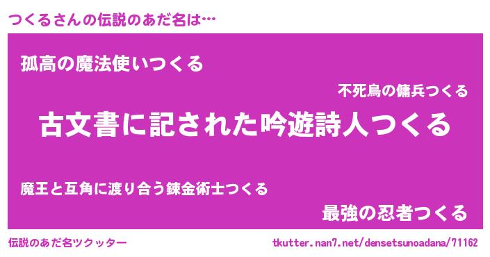 | ヒーロー風カッコイイあだ名 | 『ネオツクル』『魔戒騎士ツク』 |