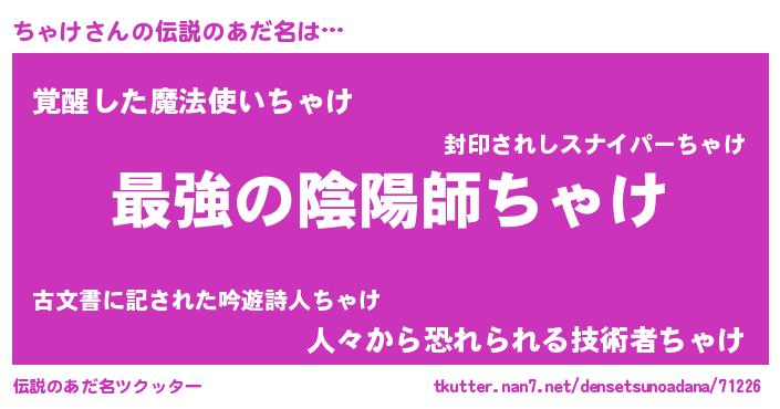 | 男性向けラノベタイトル風あだ名 | 『ちゃけに滅ぼされるだけの簡単なお仕事です』 |