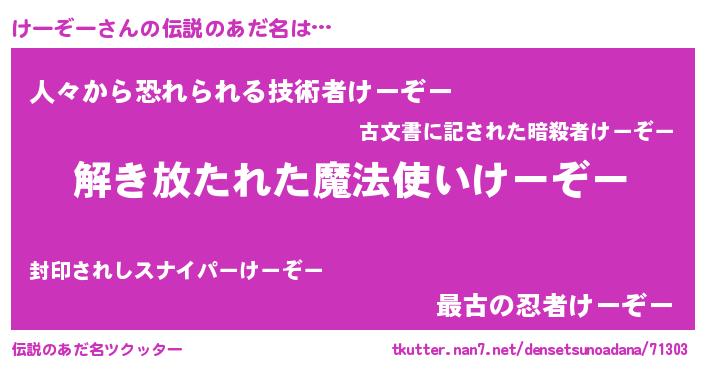 | 意味不明あだ名 | 『住所不定無職けーぞー(1歳)』 |
