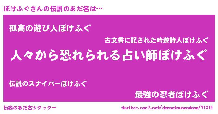 | 男性向けラノベタイトル風あだ名 | 『おまえをオタクにしてやるから、俺をぼけふぐにしてくれ! 』 |