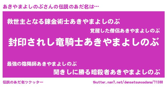 | 胡散臭い通販商品みたいなあだ名 | 『億万長者になれるブレスレット…その名も「あきやまよしのぶ」』 |