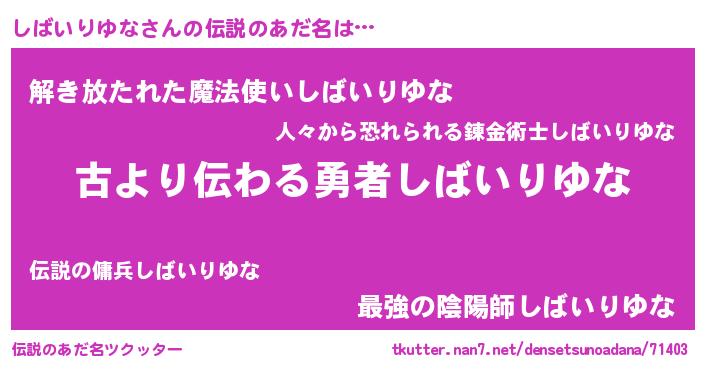 | 男性向けラノベタイトル風あだ名 | 『しばいりゆなという概念が存在しない退屈な世界 』 |