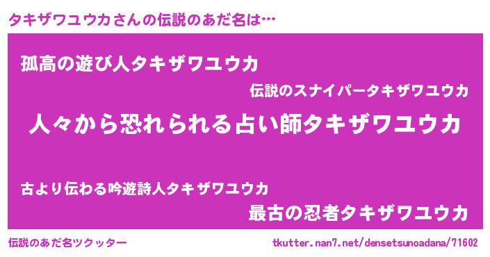 | 男性向けラノベタイトル風あだ名 | 『魔弾の王とタキザワユウカ』 |