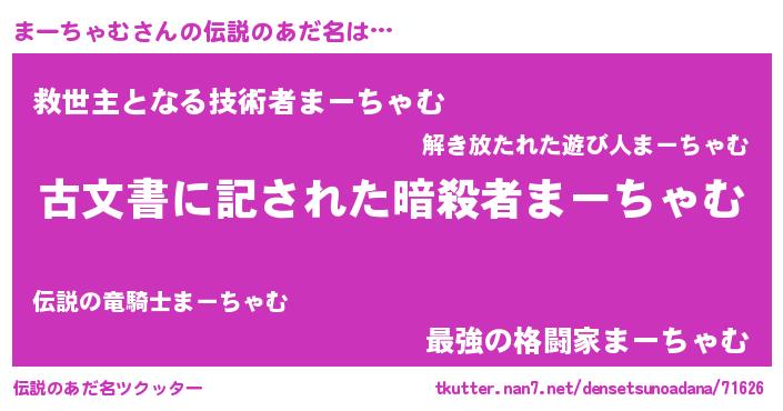| 男性向けラノベタイトル風あだ名 | 『まーちゃむに滅ぼされるだけの簡単なお仕事です』 |