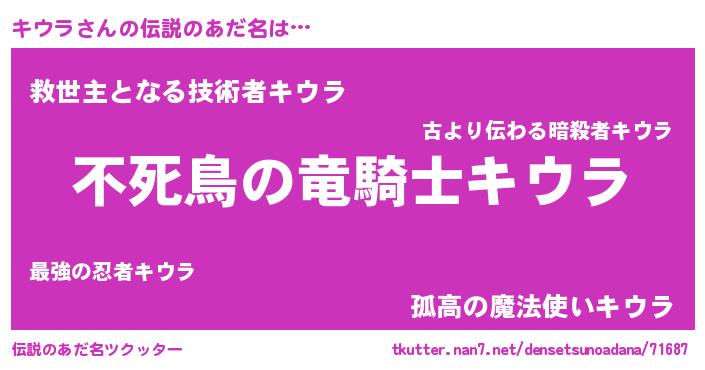 | 女子向けラノベタイトル風あだ名 | 『キウラ姫と円卓の騎士』 |