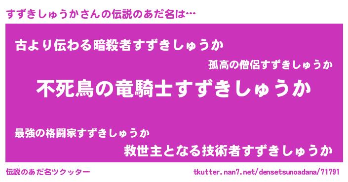 | 女子向けラノベタイトル風あだ名 | 『すずきしゅうか姫と円卓の騎士』 |