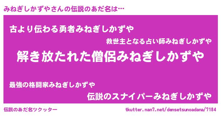 | 女子向けラノベタイトル風あだ名 | 『みねぎしかずやの卵を拾いまして』 |