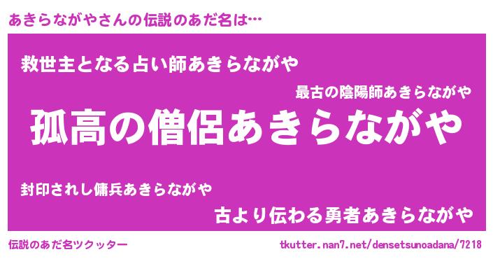 | 胡散臭い通販商品みたいなあだ名 | 『信頼と実績のネックレス…その名も「あきらながや」』 |