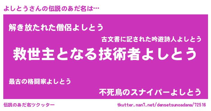 | 男性向けラノベタイトル風あだ名 | 『うちのよしとうが世界を掌握している!』 |