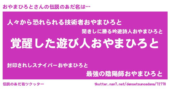 | 男性向けラノベタイトル風あだ名 | 『おやまひろとの嫁は女の子じゃないと思った?』 |