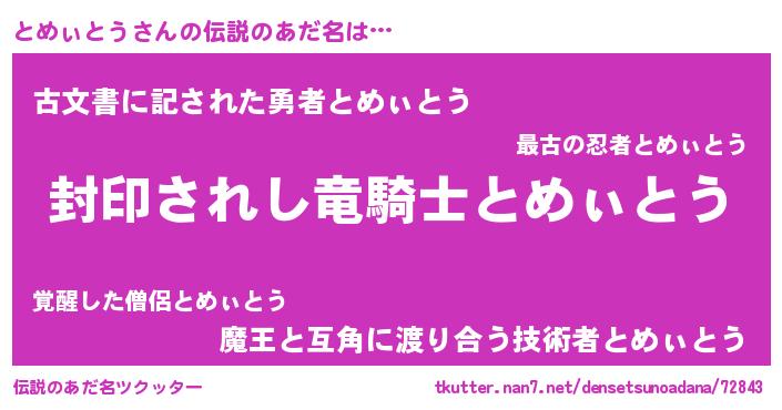 | 男性向けラノベタイトル風あだ名 | 『とめぃとうに滅ぼされるだけの簡単なお仕事です』 |