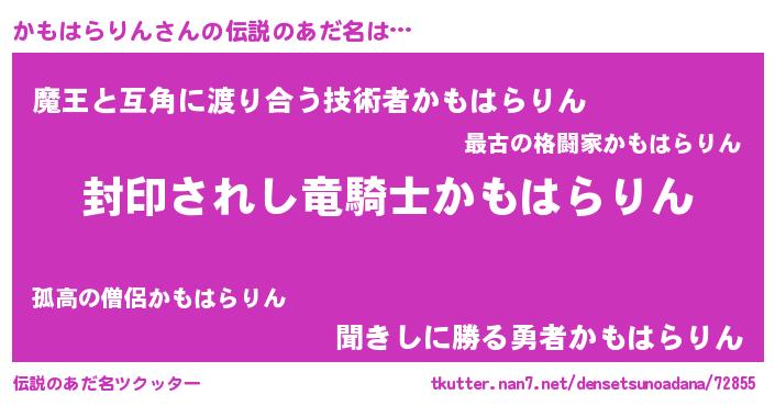 | 意味不明あだ名 | 『住所不定無職かもはらりん(5歳)』 |