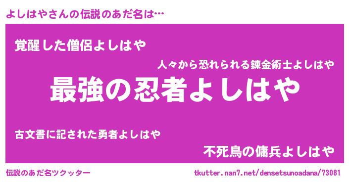 | 胡散臭い通販商品みたいなあだ名 | 『あなたにだけ特別に提供する限定10本のレアな日本酒…その名も「よしはや」』 |