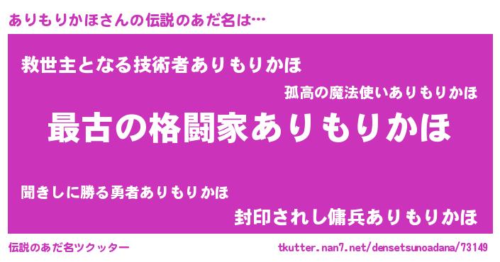 | 男性向けラノベタイトル風あだ名 | 『ありもりかほに滅ぼされるだけの簡単なお仕事です』 |