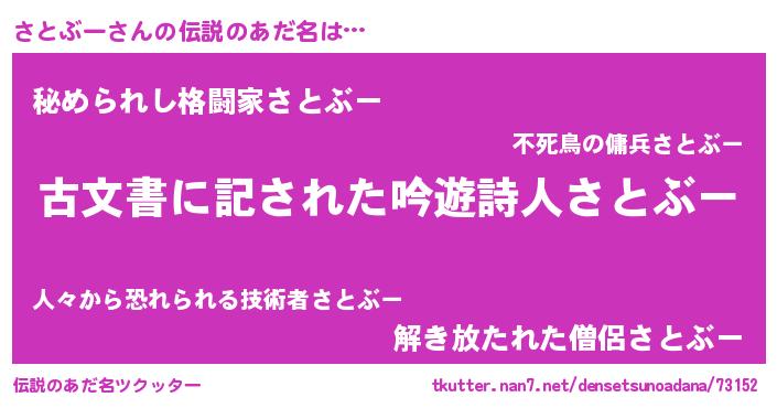 | 女子向けラノベタイトル風あだ名 | 『闇のさとぶー』『さとぶー伯爵の花嫁』 |