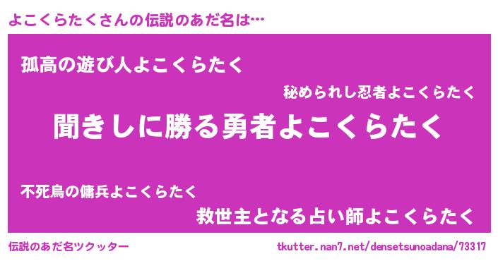 | 男性向けラノベタイトル風あだ名 | 『よこくらたくという概念が存在しない退屈な世界 』 |